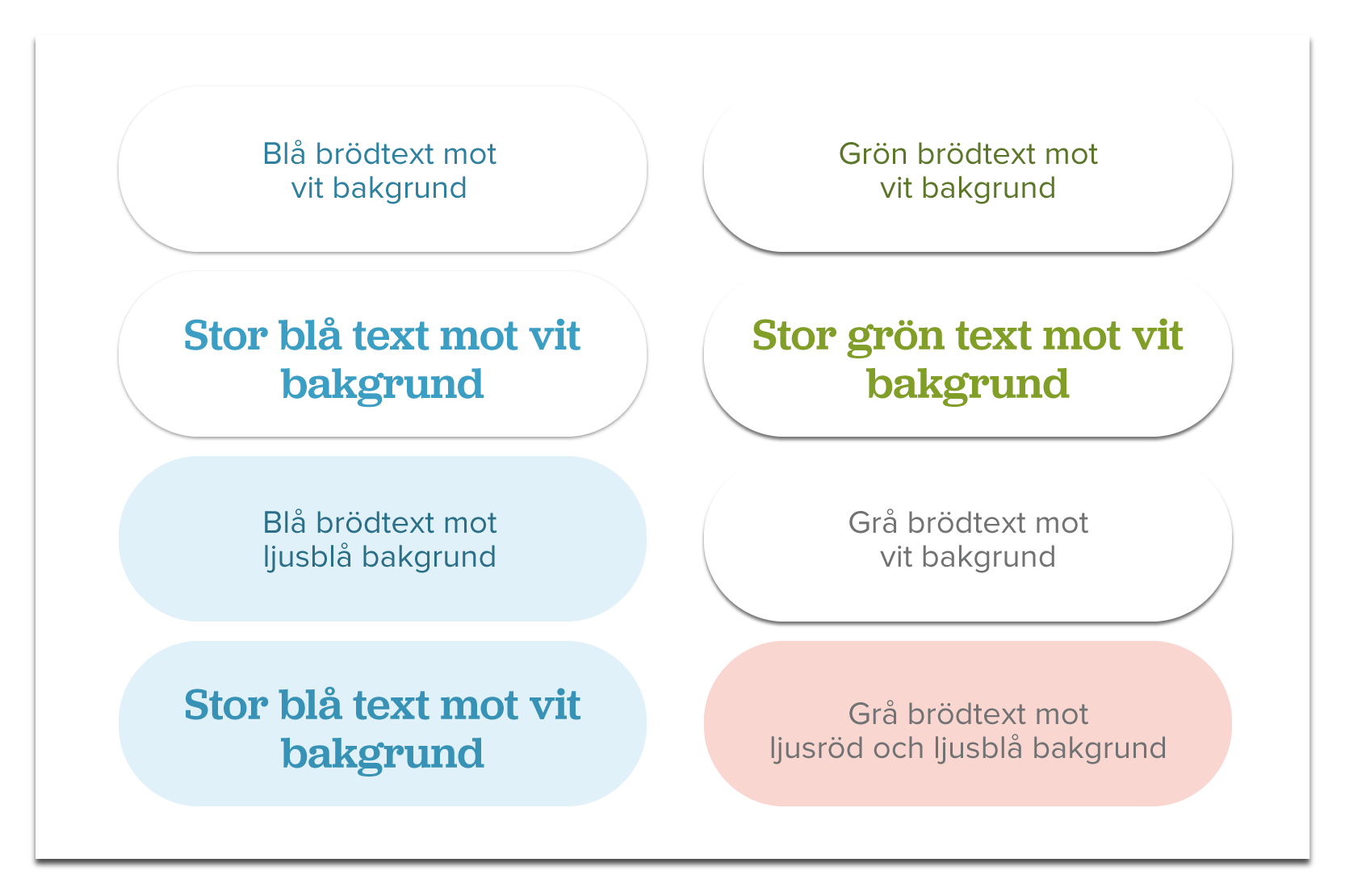 Vår färgpalett specificeras i färgformaten Pantone©, CMYK och RGB, för att så långt som det är möjligt säkerställa att färgerna upplevs lika i alla kanaler. För CMYK-tryck bör alltid en Pantone©-färgreferens bifogas för att säkerställa önskat resultat.
